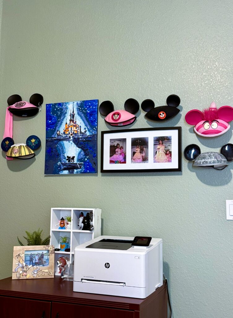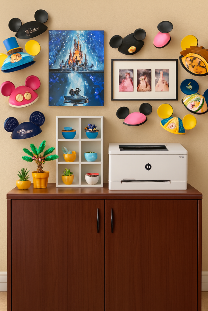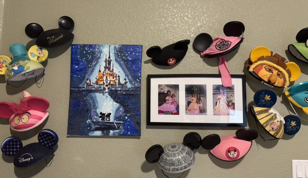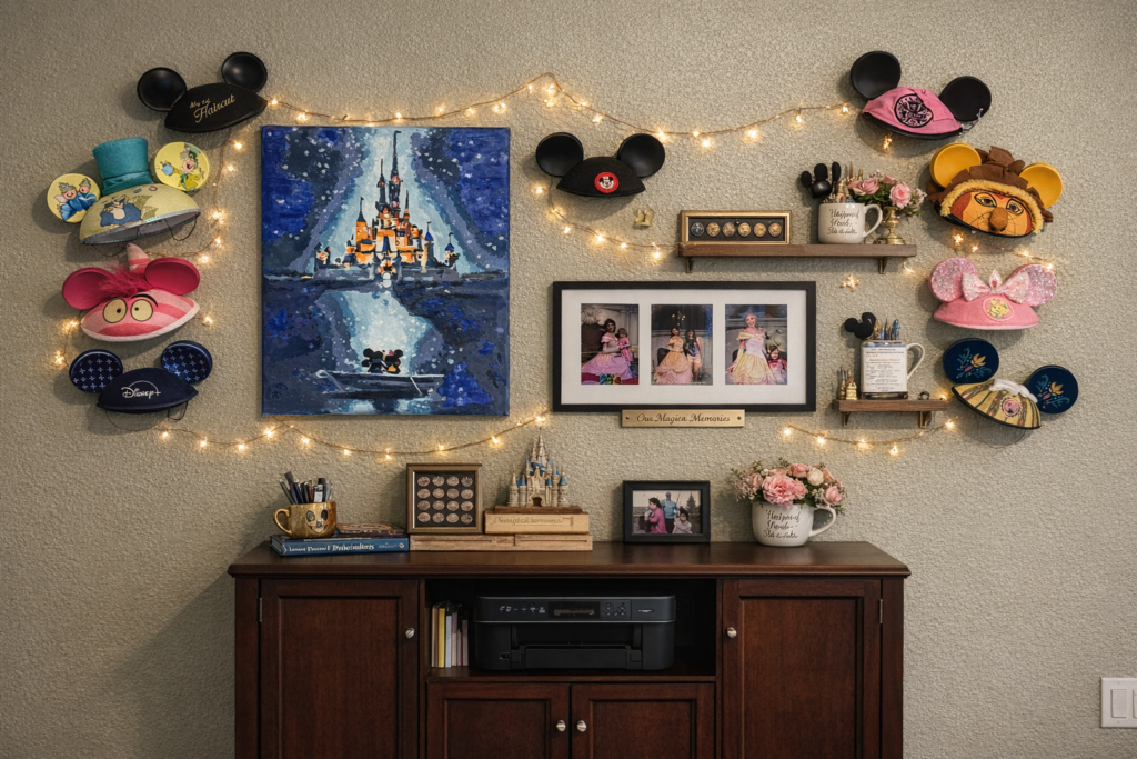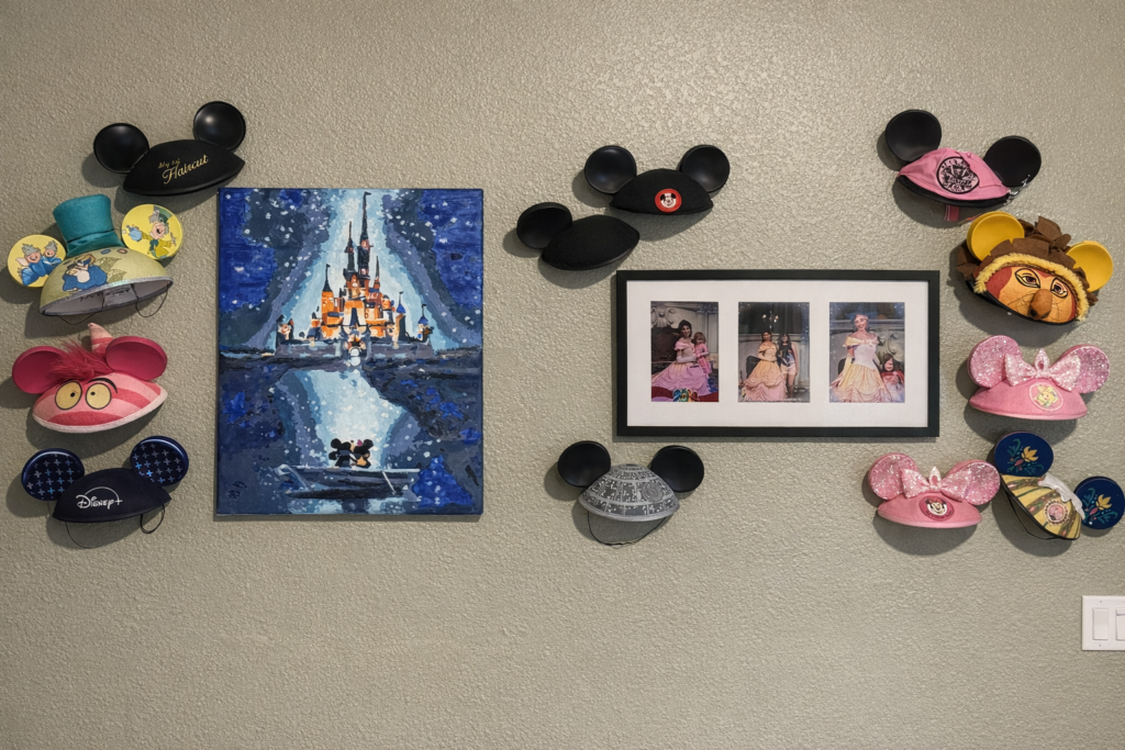 - Curated Disney Display with an Anchor piece (the canvas), hat styling – instead of spreading them out loosely mount them on a clean grid or staggered shelf display. Photo collage, it suggested a reframe in a larger mat or frame to match the canvas.