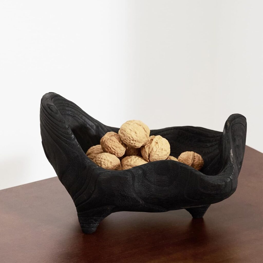 This funky, shaped wood bowl might be kind of cool here. I think I would leave it empty though.
