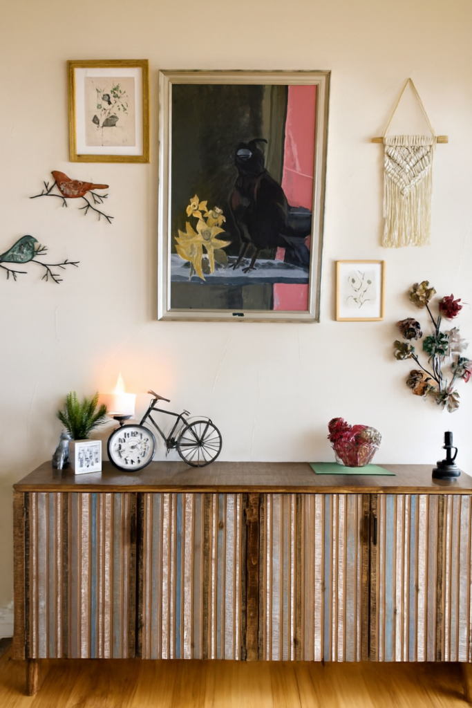 Looking at the pieces you’ve shared, you already have a great eclectic mix: bold art with the raven painting, colorful metal wall accents, and then the rustic vignette with the bicycle clock, dog figurine, and woven spheres. To “jazz it up,” you can lean into layering textures and adding a few playful, cozy touches that tie everything together.