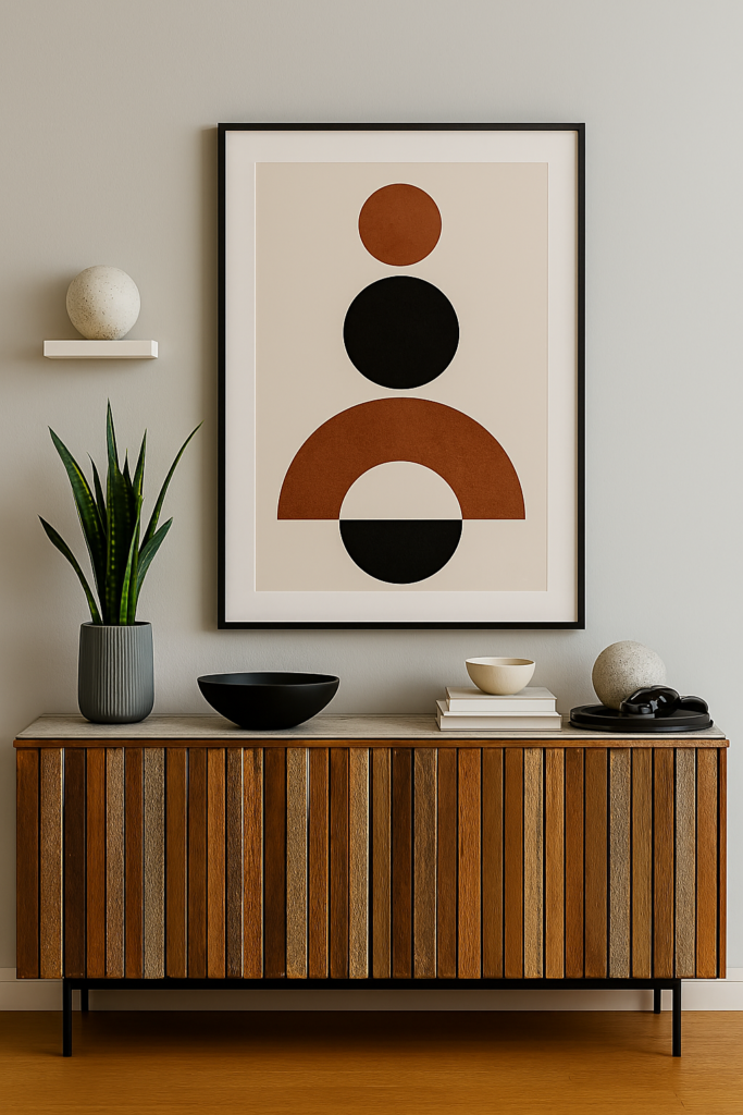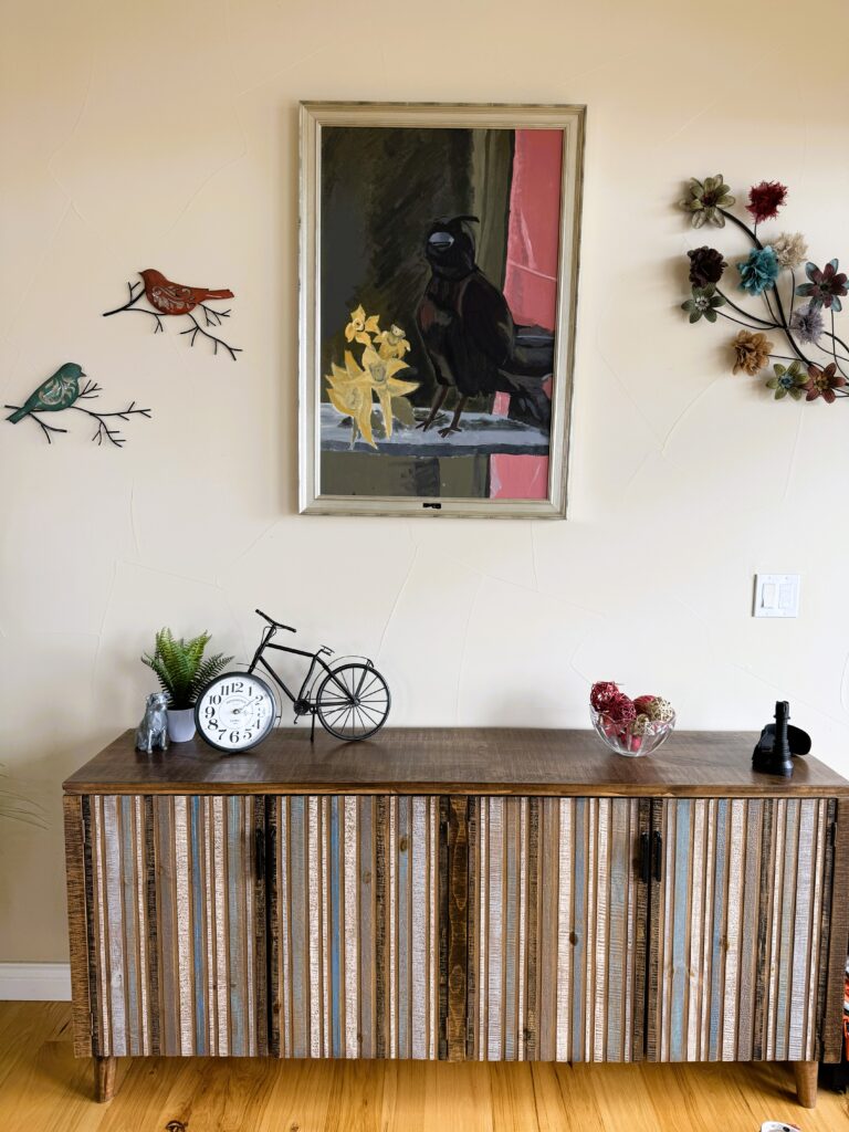 Okay it’s time again for another AI powered wall makeover. This is a quiet little space in our home that sits in the entryway area from our deck to the family room. It’s kind of a lost space because it’s too far away to mix with the actual family living space where we watch tv or gather by the fireplace. We fell in love with the cabinet when we were actually shopping for a new couch. It’s a great place to store puzzles and games for us. It’s kind of light on decor otherwise. We threw some random pieces we already had to make this space. I wanted to see what the potential could be.