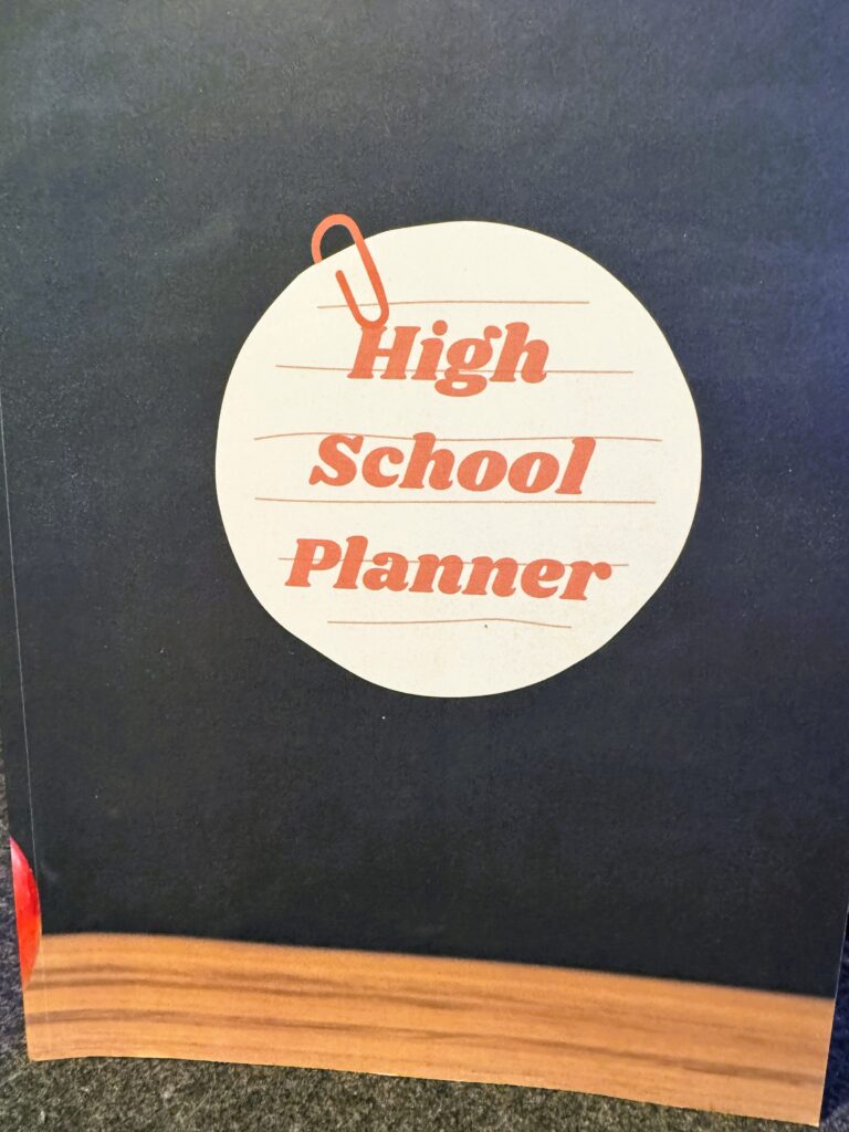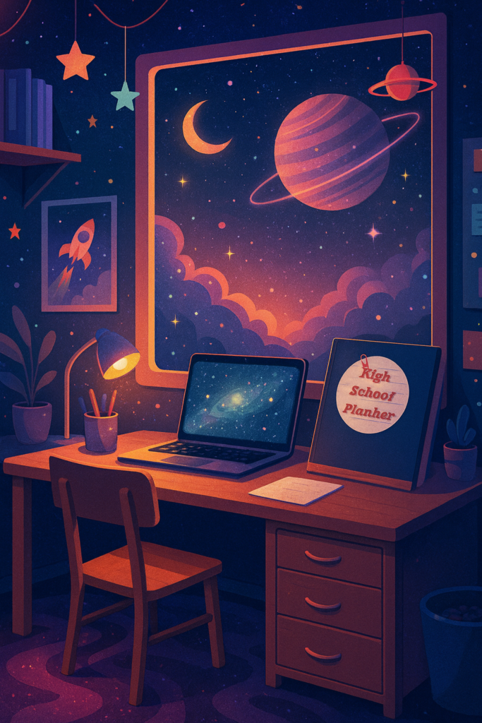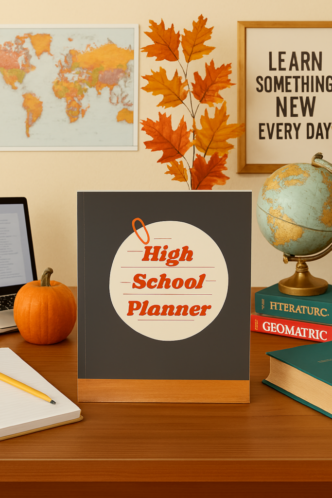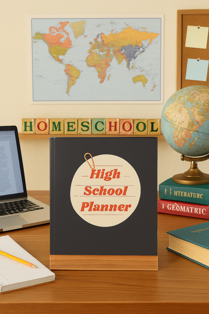 And the AI description: Here’s your planner in a warm homeschooling setting! The scene places your High School Planner at the center of a cozy desk surrounded by classic homeschool touches—alphabet blocks spelling “Homeschool,” a chalkboard with ABCs, colorful number posters, pencils, and even an apple for that timeless school vibe. It feels inviting, family-centered, and perfectly aligned with the homeschooling theme you wanted.